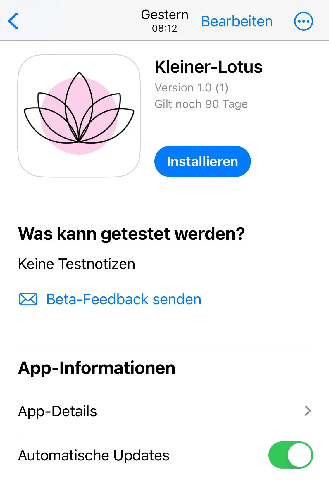 Nachdem Du die Einladung zum Test akzeptiert hast, wird Dir die App “Kleiner-Lotus” in TestFlight angezeigt. Tippe auf “Installieren”, um die App auf Deinem iPhone zu installieren. Nach Abschluss der Installation findest Du die App “Kleiner-Lotus” neben Deinen anderen Apps auf dem Home-Bildschirm Deines iPhones.